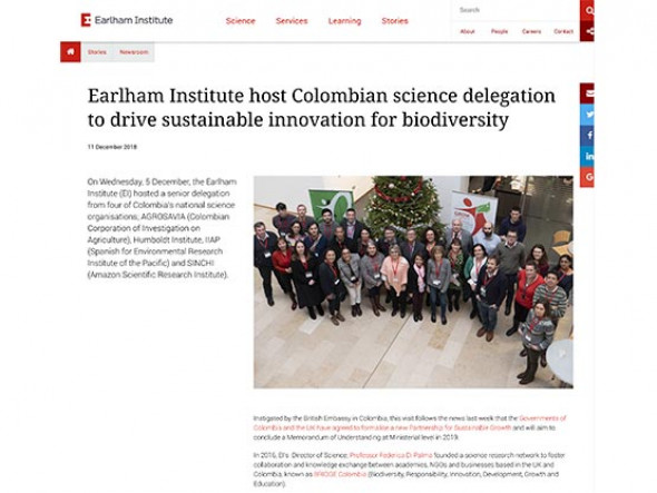 On Wednesday, 5 December, the Earlham Institute (EI) hosted a senior delegation from four of Colombia’s national science organisations; AGROSAVIA (Colombian Corporation of Investigation on Agriculture), Humboldt Institute, IIAP (Spanish for Environmental Research Institute of the Pacific) and SINCHI (Amazon Scientific Research Institute).